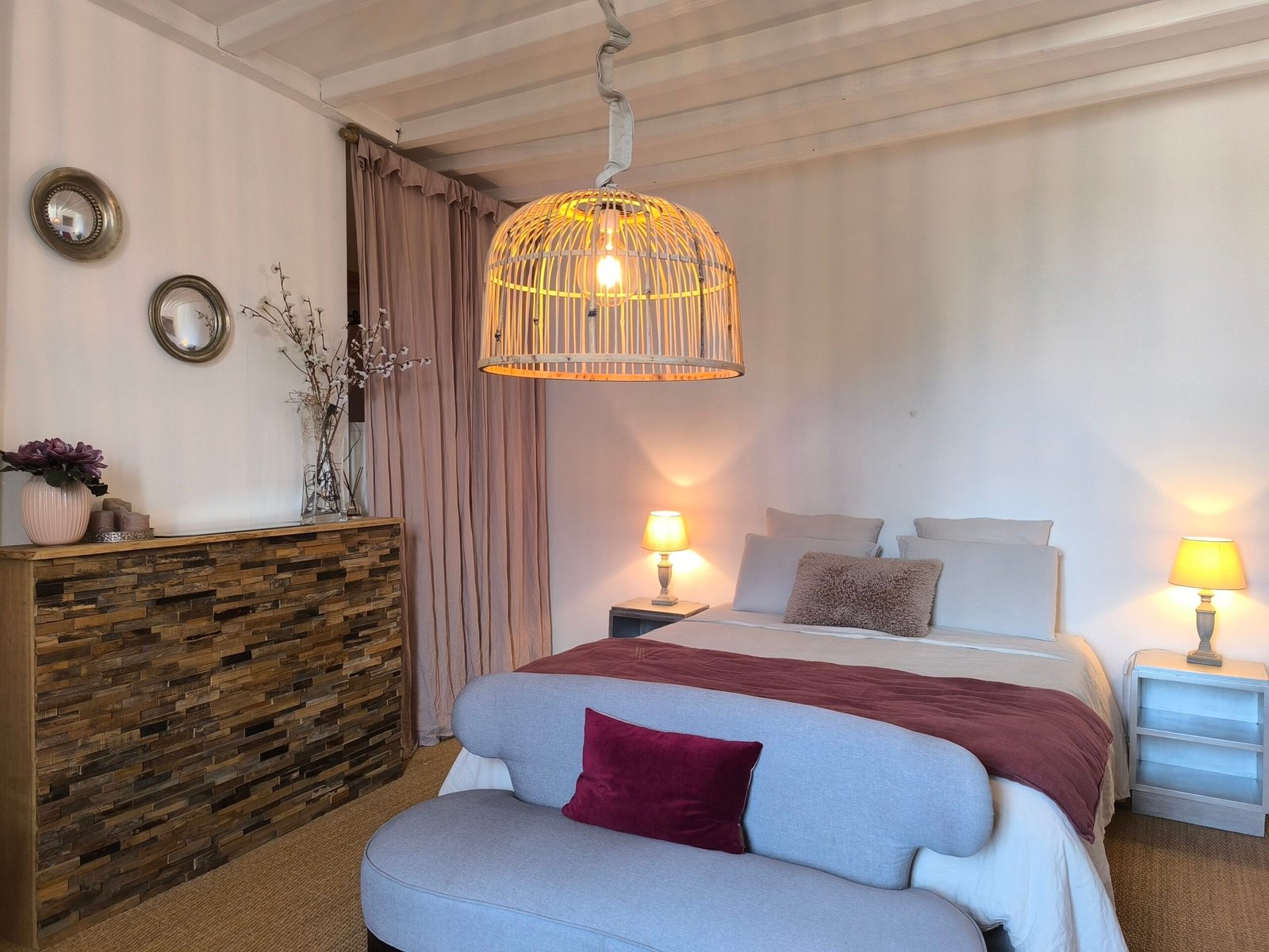 Inspirée par la richesse de notre terroir, la décoration mêle tons lie de vin et lin, rappelant les vignes voisines et les reflets changeants de la Loire. Vous y trouverez un coin salon intime, un bureau pour vos écrits ou lectures tranquilles, ainsi qu’un dressing pour poser vos valises et vous sentir immédiatement chez vous.